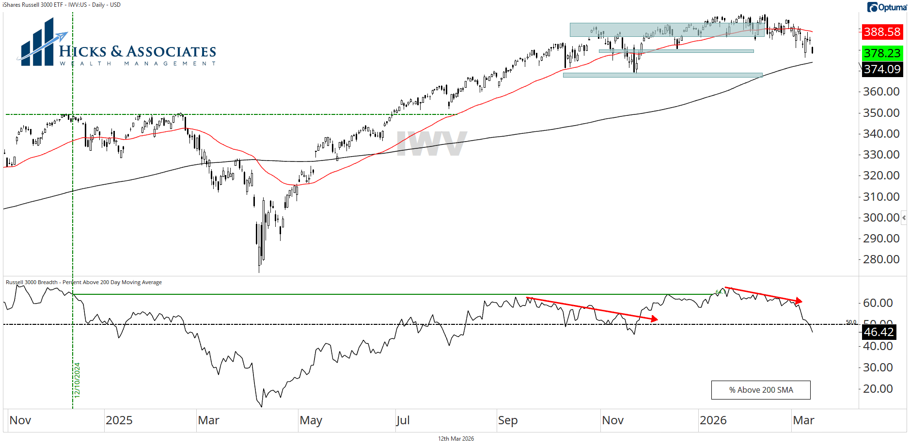 Taking another view of IWV, this third chart shows (in the bottom pane) that only 46% of the IWV constituents are above their own 200-day moving average. Said differently, this means that 54% of the IWV constituents - which, remember, represents about 98% of the US Stock Market - are in a technical downtrend.