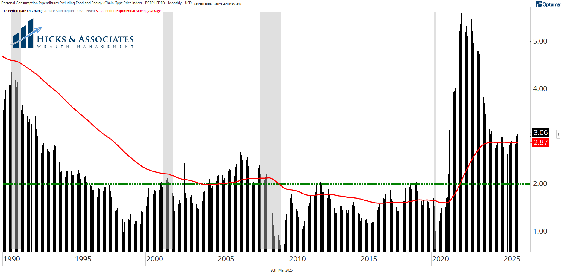 As a measure of inflation, the Federal Reserve prefers PCE as opposed to the more common CPI. Our second chart today is "Core" PCE, which removes food and energy from the PCE equation. Given the war in Iran, the spike in oil is obviously a concern as the cost of oil affects transportation costs, which can also impact the cost of food. So, yes, we should be a little concerned about the massive spike in the price of oil.